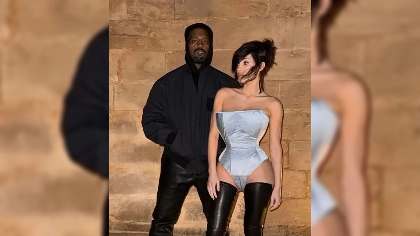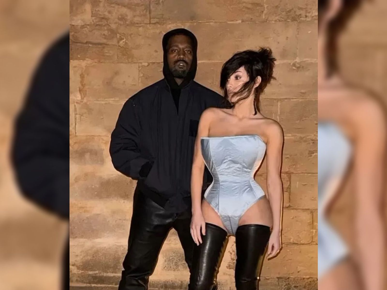 Nella foto, la donna indossa un body rivelatore e alti stivali di pelle nera. Kanye ha scelto una felpa con cappuccio nera, un bomber e pantaloni di pelle per il servizio fotografico.