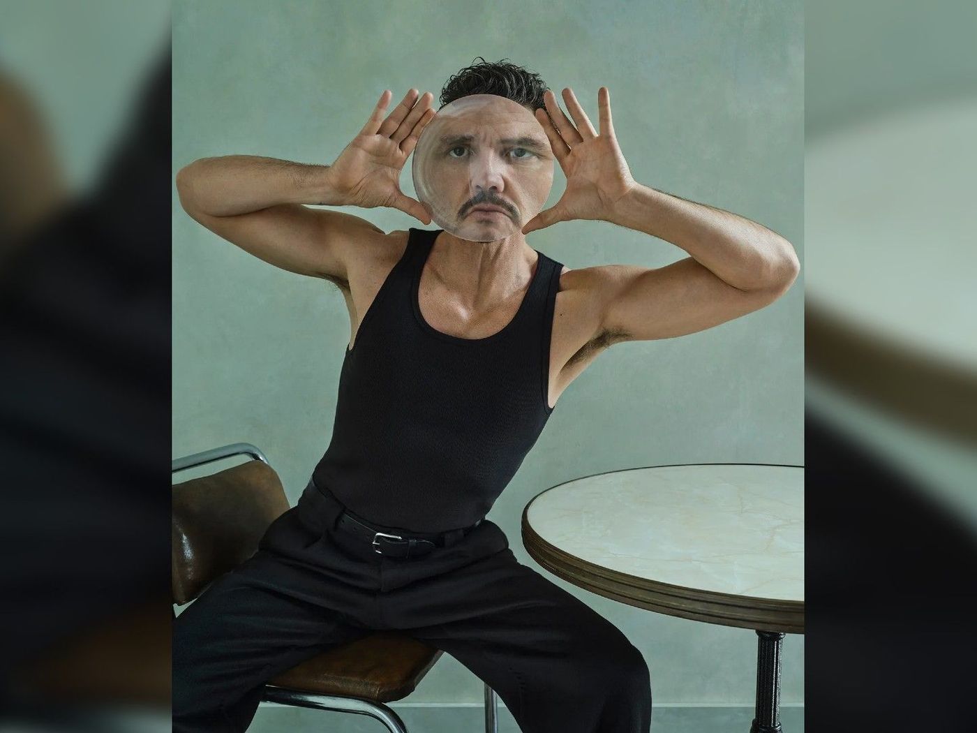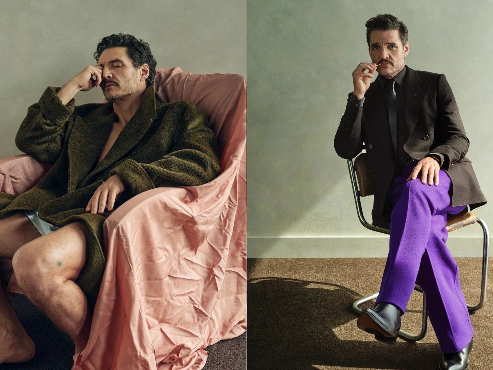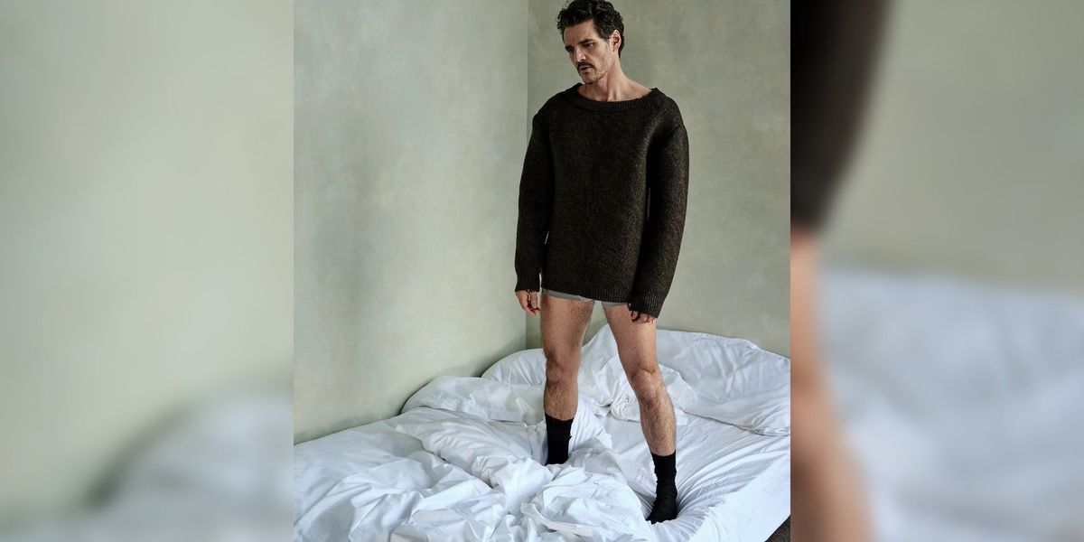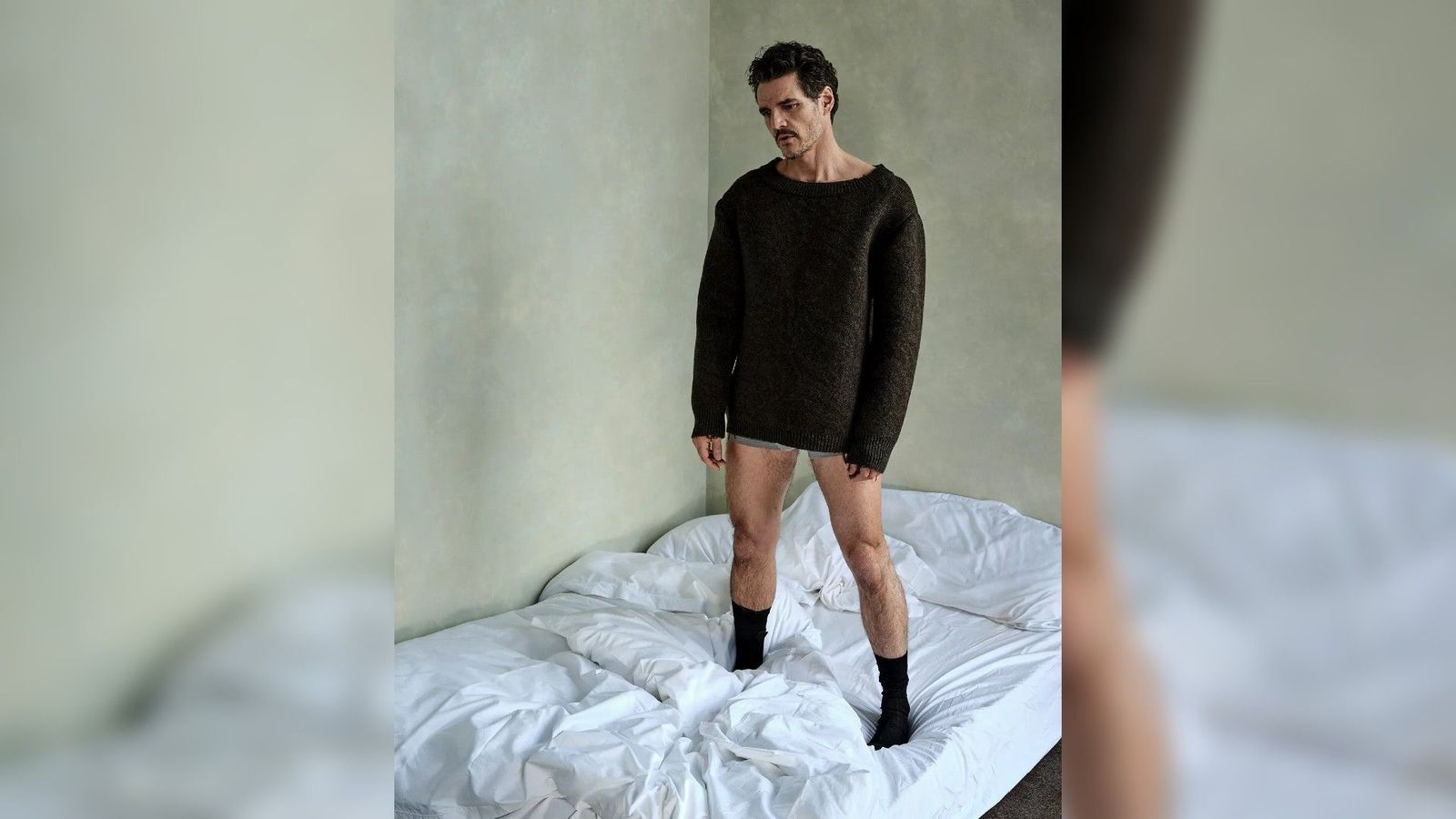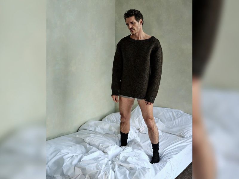In uno degli scatti più giocosi del servizio, Pascal posa con un maglione Prada e calzini... e senza pantaloni.
