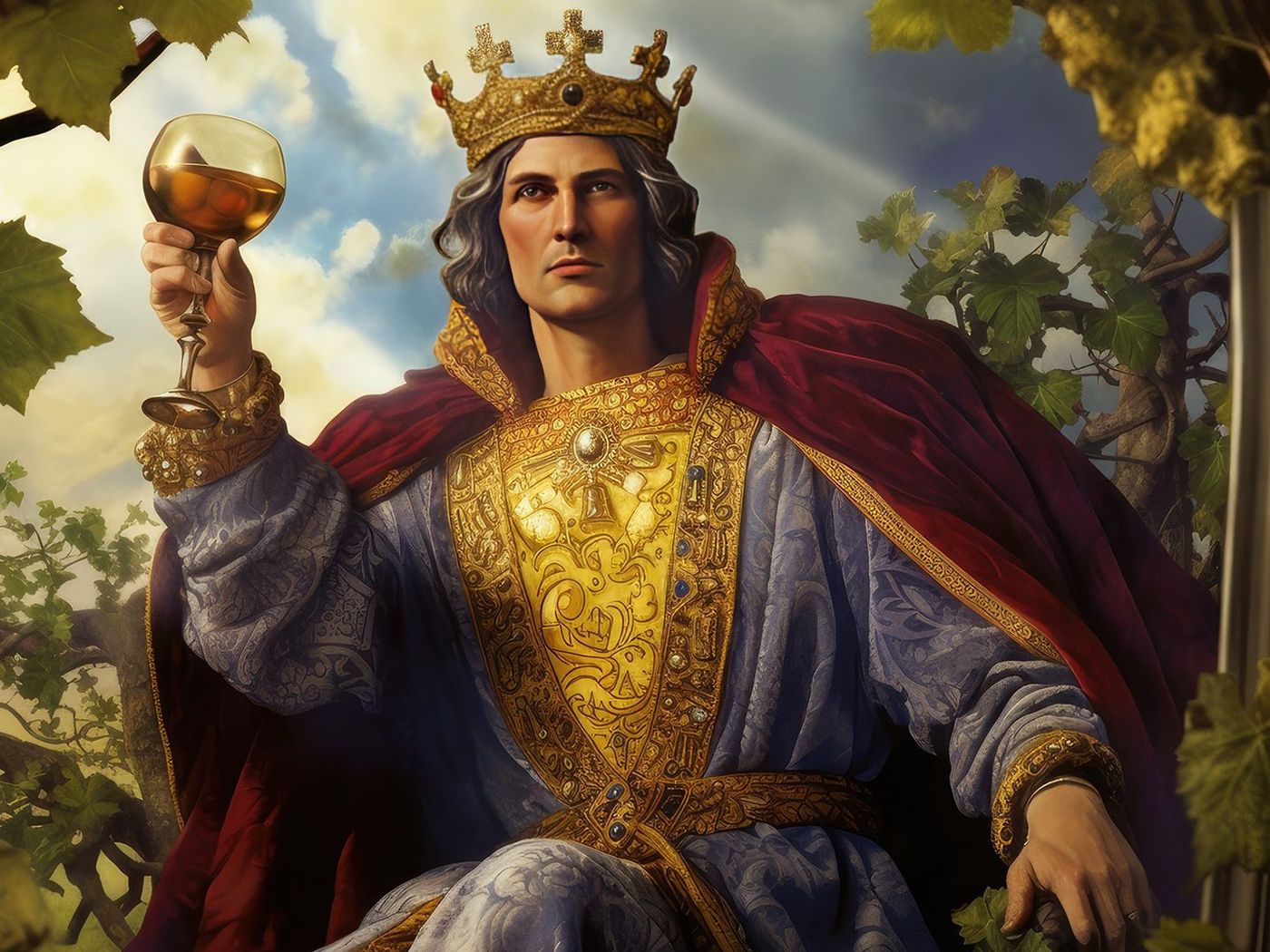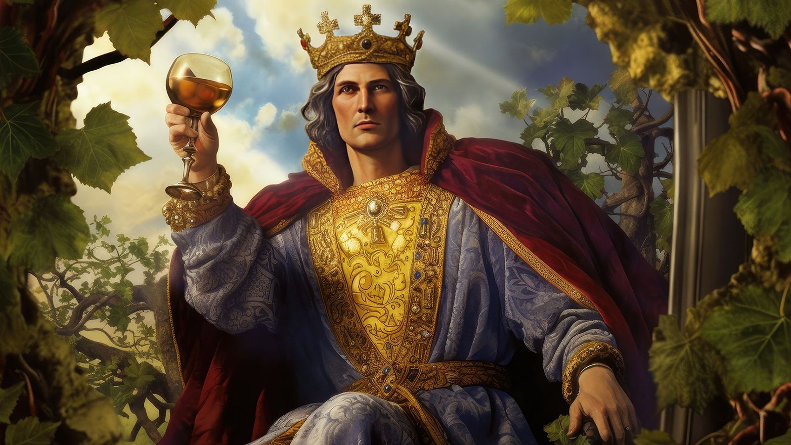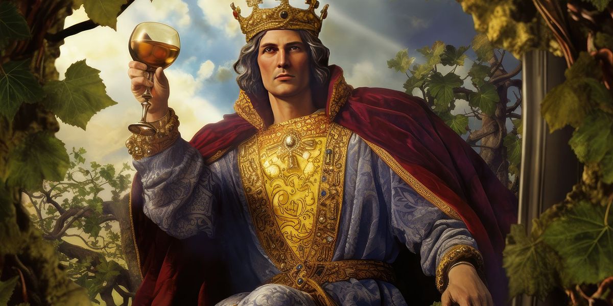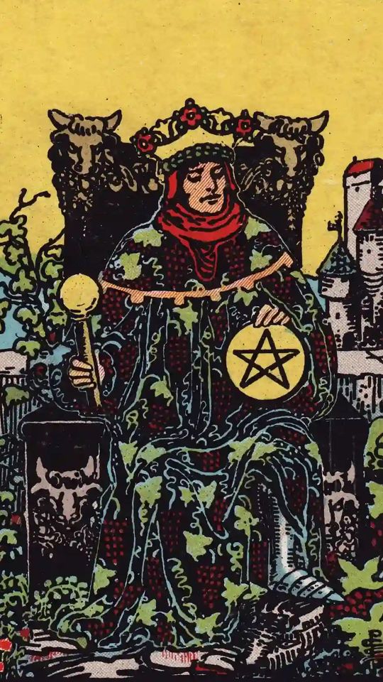 La veste del Re è adornata con un motivo di viti. In tale contesto, l'uva rappresenta fertilità e saggezza. Come si gusta un buon vino, così il Re di Denari si compiace delle benedizioni in suo possesso.