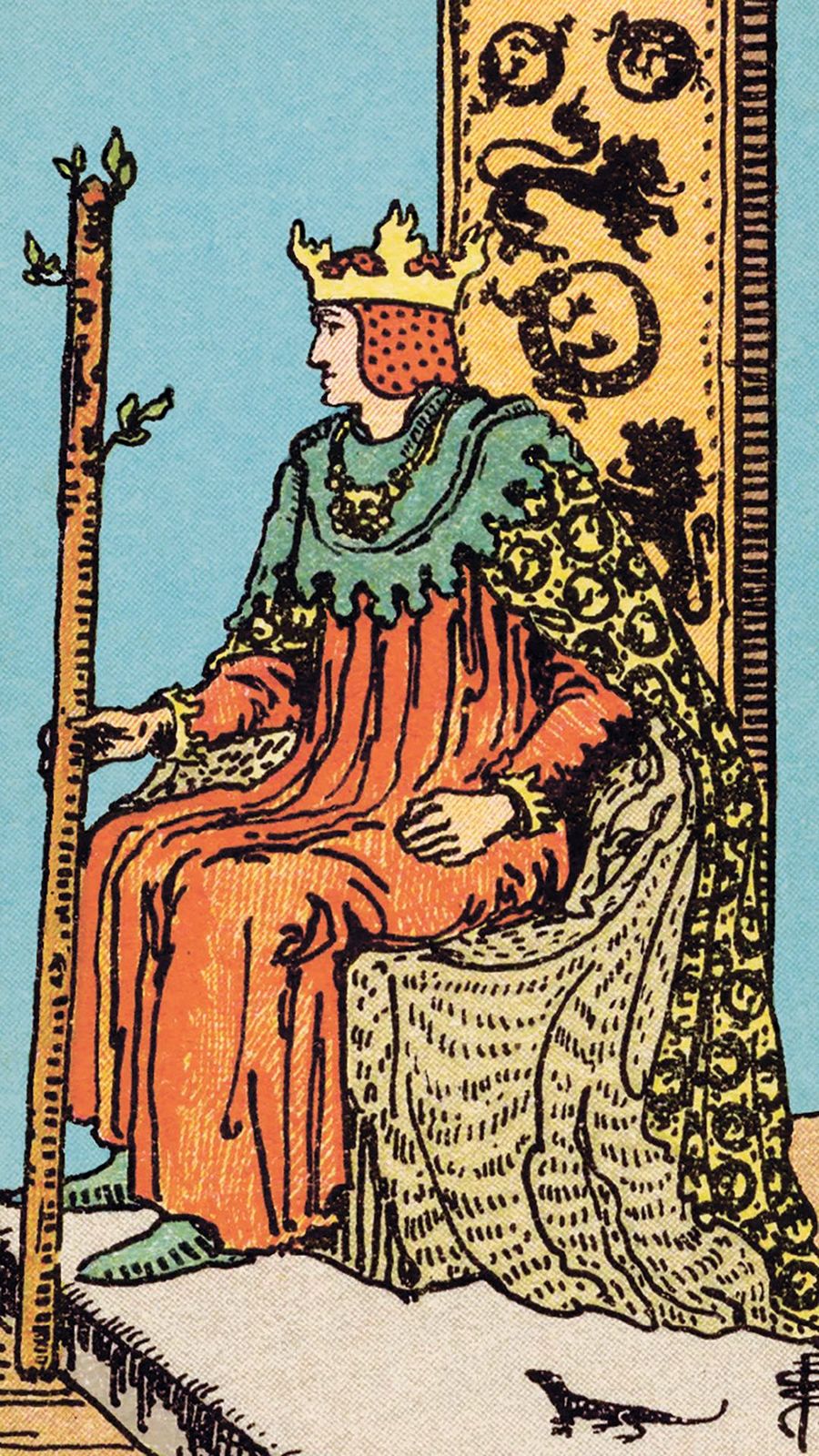 Il Re siede su un trono decorato con leoni e salamandre, simboli di fuoco e potenza. Il trono oltrepassa i bordi della carta, rivelando il potere sconfinato del Re. Spingendosi oltre il margine superiore, connette il Re di Bastoni alle sfere divine.