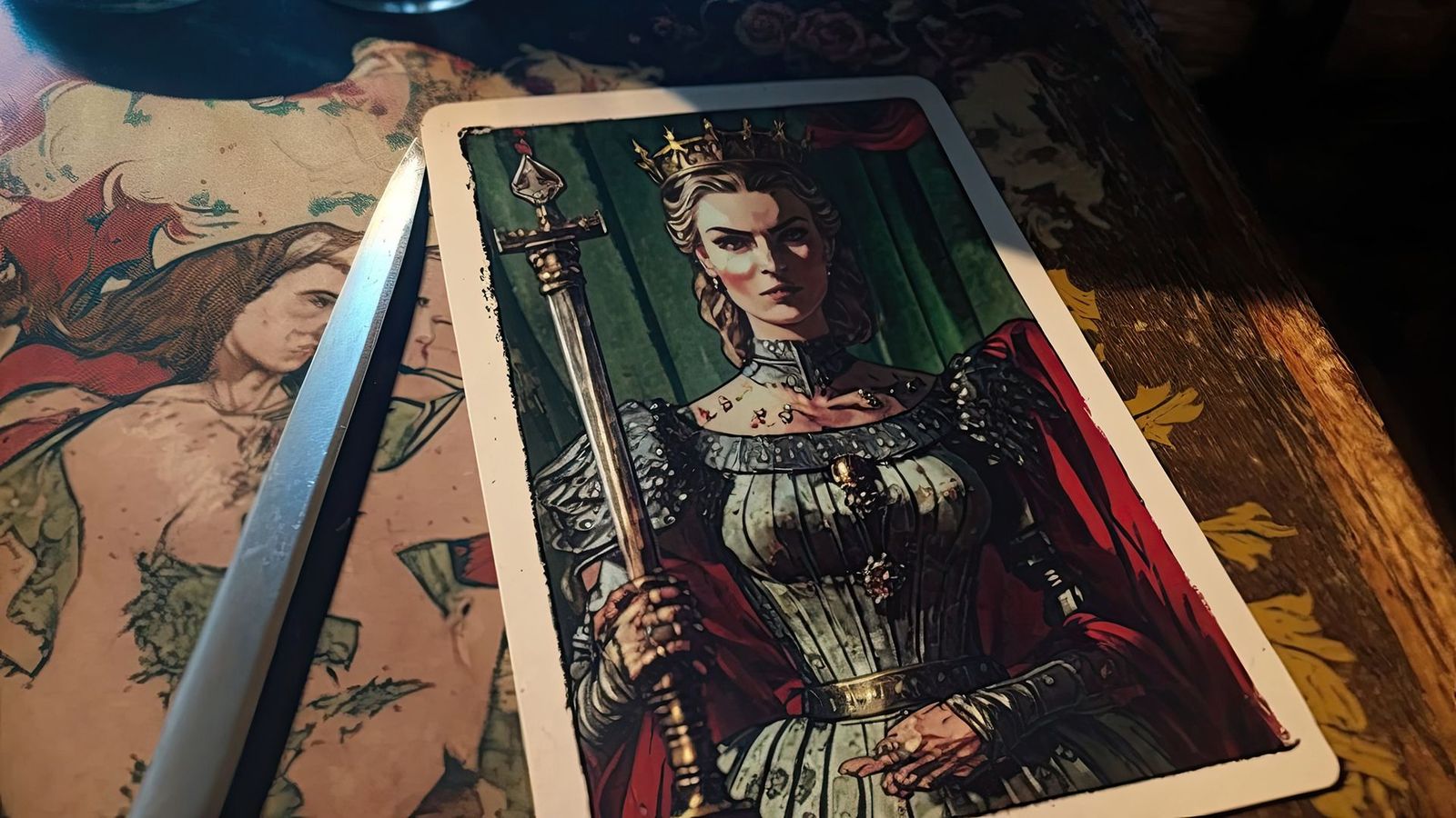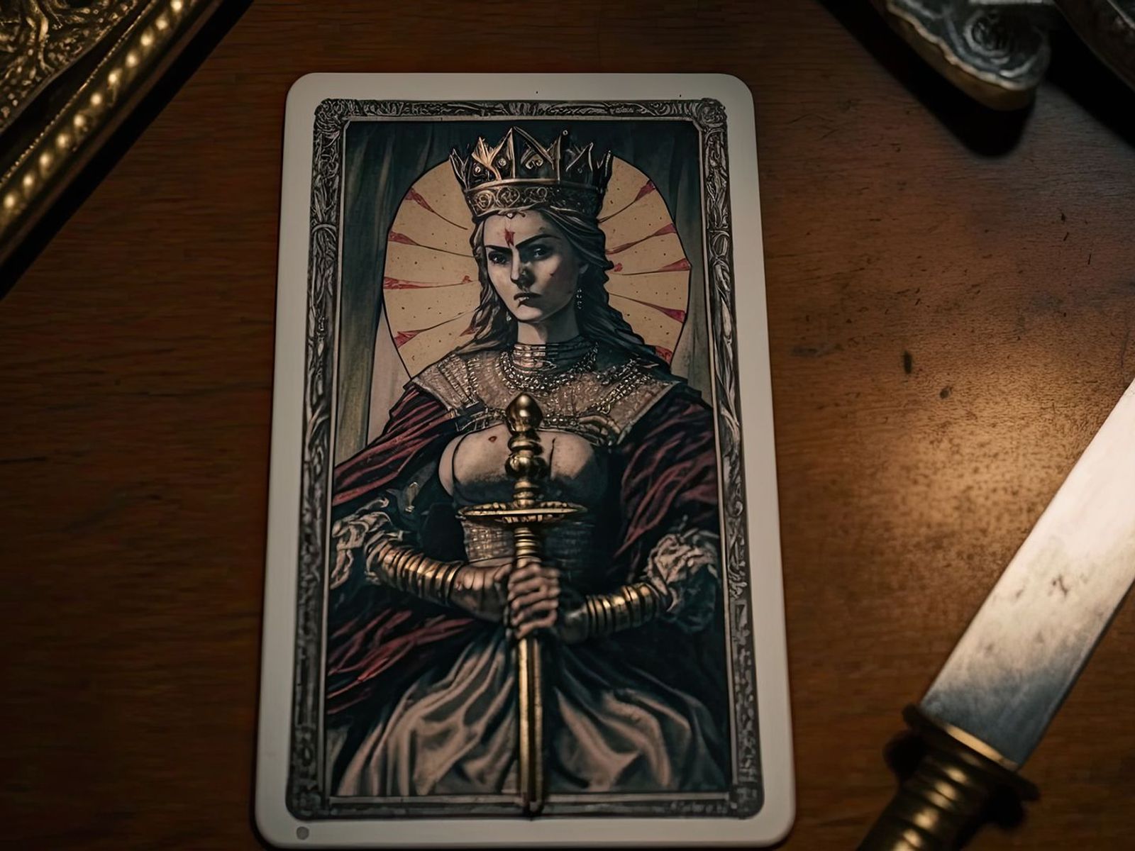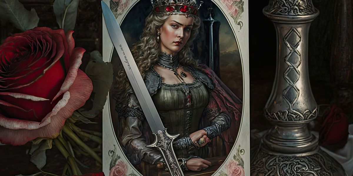 - La spada. La Regina impugna una spada nella mano destra e la punta verso l'alto. Questo rappresenta il suo desiderio di conoscere sempre la verità, oltre alla base morale del suo intelletto. Mentre le spade della Corte Reale delle Spade si estendono oltre la carta, la Regina non ne ha bisogno: sa chi è e non deve confermare il suo status con la forza.