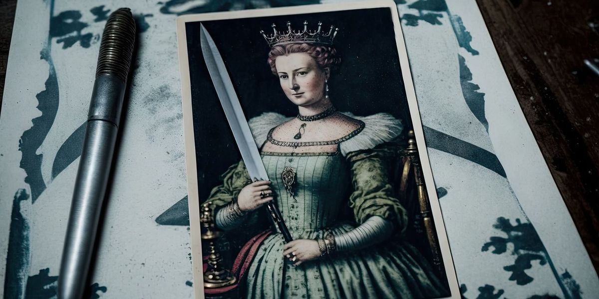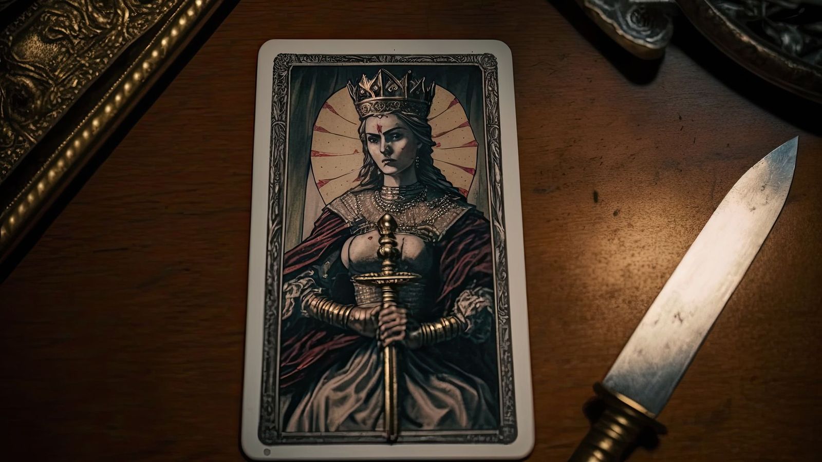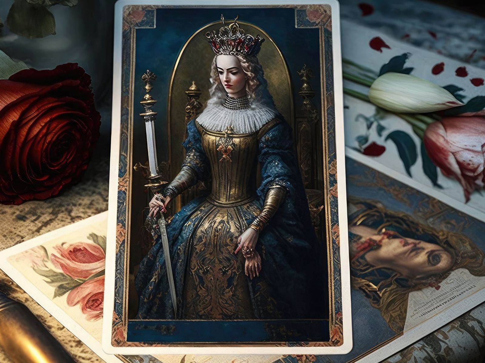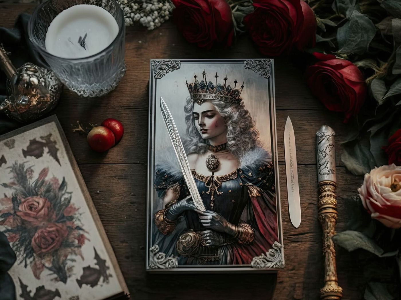 - La spada. La Regina impugna una spada nella mano destra e la punta verso l'alto. Questo rappresenta il suo desiderio di conoscere sempre la verità, oltre alla base morale del suo intelletto. Mentre le spade della Corte Reale delle Spade si estendono oltre la carta, la Regina non ne ha bisogno: sa chi è e non deve confermare il suo status con la forza.