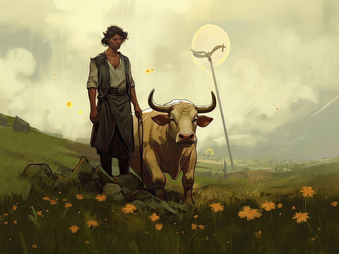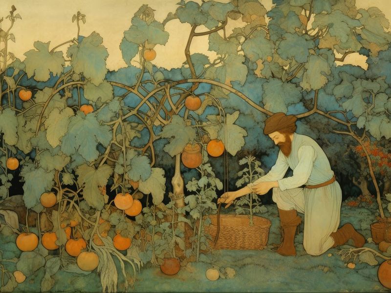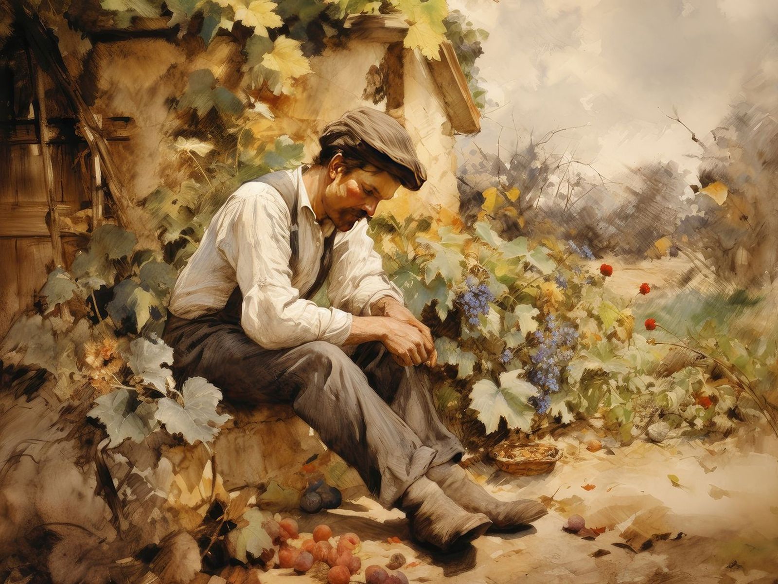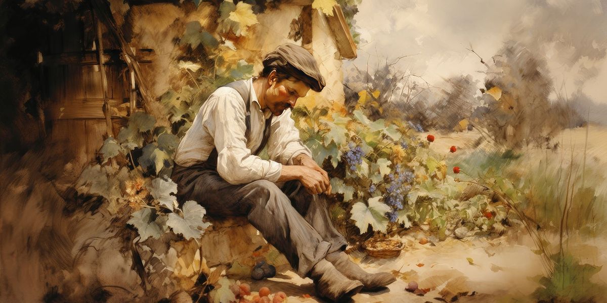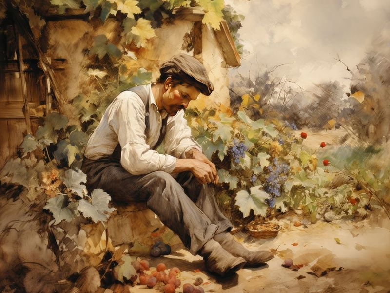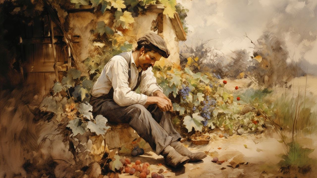 - Il contadino appare provato e meditabondo, rivelando le difficoltà e le incertezze del suo lavoro. Si domanda se il raccolto sarà all'altezza delle aspettative e quale sarà il guadagno.