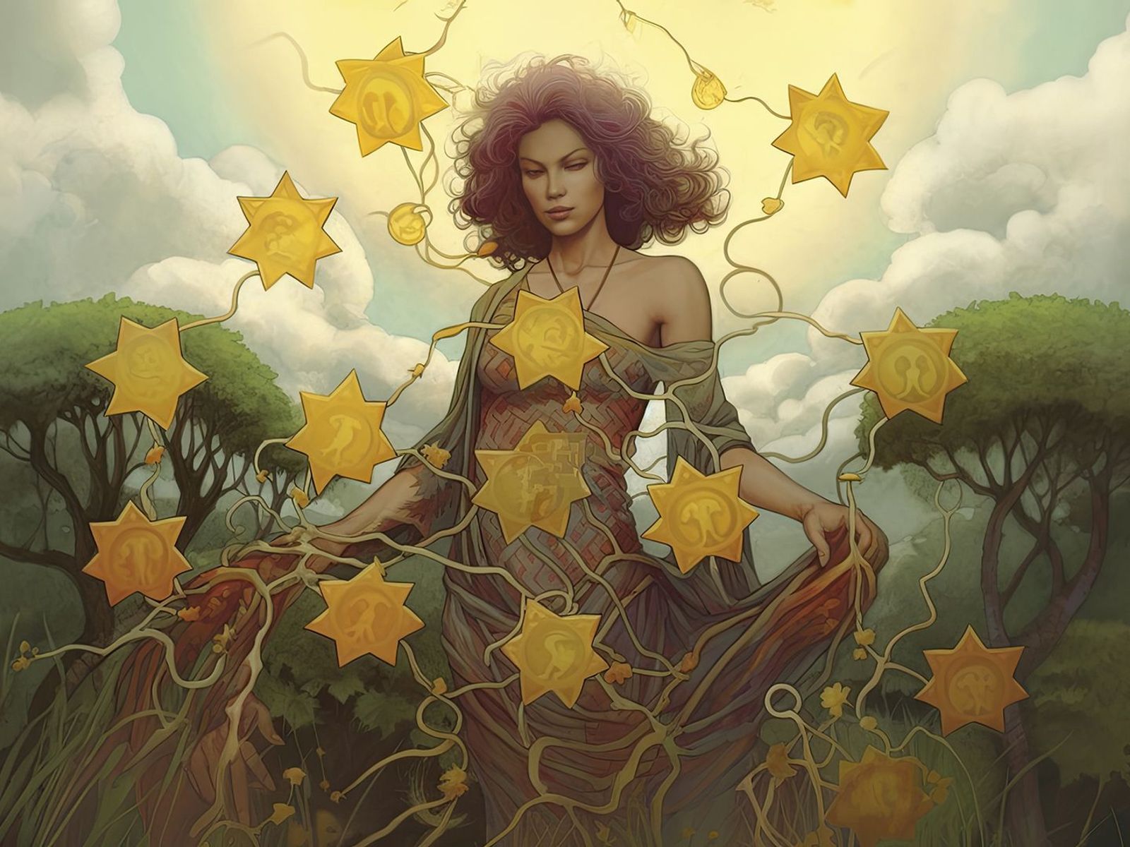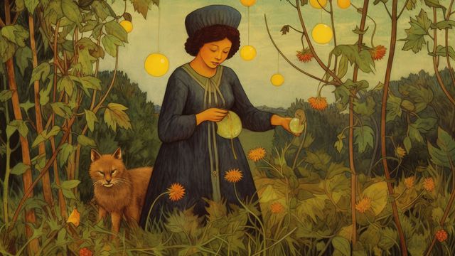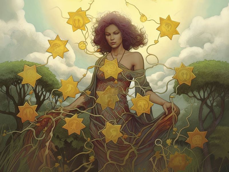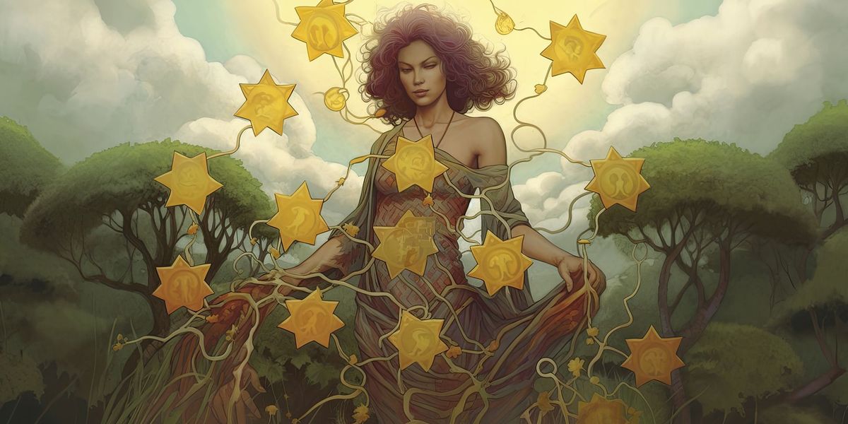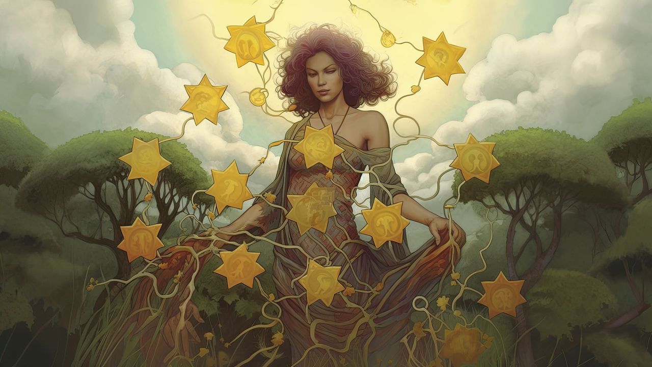 - L'albero ornato di pentacoli simboleggia ricchezza e prosperità materiali. Questi simboli sottolineano il valore del raccolto e i guadagni che ne derivano.