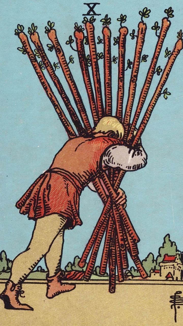 In ogni caso, il Dieci di Bastoni simboleggia la tua tenacia, determinazione, forza di volontà e ambizione. Tuttavia, ti ricorda anche che il prezzo delle vittorie e dei successi può rivelarsi incredibilmente alto.