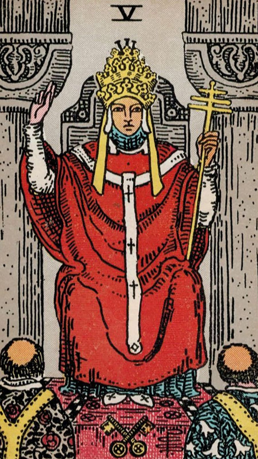 La carta del Papa raffigura un uomo in veste, seduto su un trono. Nella mano sinistra tiene una croce papale, simbolo del servizio papale. Le tre traverse rappresentano il più alto grado spirituale e indicano che rappresenta Dio nei tre regni: terrestre, celeste e infernale. La mano destra del Papa è alzata in un gesto di benedizione. Il suo abbigliamento riflette la sua autorità e posizione nella gerarchia spirituale.In primo piano, sono visibili le spalle di due monaci. Simboleggiano il pubblico a cui il Papa impartisce la sua conoscenza. A differenza della Papessa, che custodisce la saggezza nascosta, il Papa come mentore considera fondamentale condividere la saggezza superiore con l'umanità. Il motivo sulle vesti dei monaci, simile a rose rosse e gigli bianchi, simboleggia l'amore divino e la purezza.