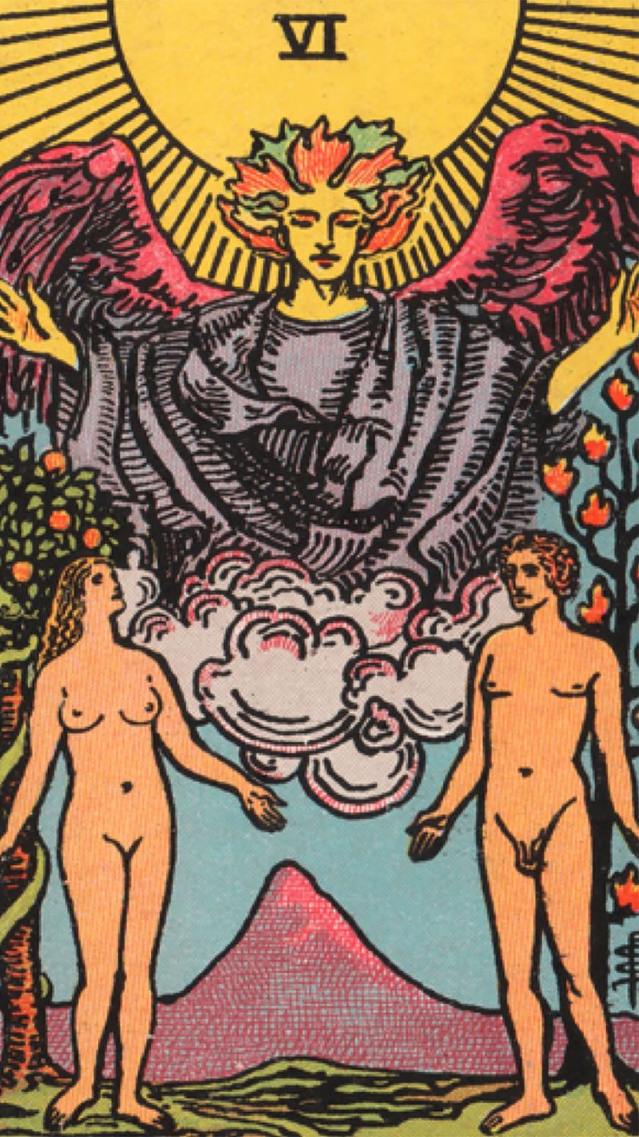 Nel mazzo classico di Waite, la carta "Gli Amanti" racchiude numerosi elementi simbolici che svelano significati profondi.La carta ritrae un giovane uomo e una donna che stanno l'uno accanto all'altra di fronte a un arcangelo. La donna si trova tra l'uomo e l'arcangelo, mentre l'uomo è rivolto verso la donna. Montagne verdeggianti, un cielo dorato e un melo fanno da cornice alla scena.